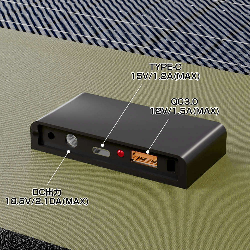 | 出力規格 | USB出力,Type-C出力,DC出力 USB出力:QC3.0(5V/3A,9V/2A,12V/1.5A(MAX)) Type-C出力:5V/3A,9V/2A,12V/1.5A,15V/1.2A(MAX) DC出力:18.5V/2.10A(MAX) ※上記3つの出力ポートはどれかが最大出力の使用条件を満たした場合 急速充電機能が優先的に使用されます |