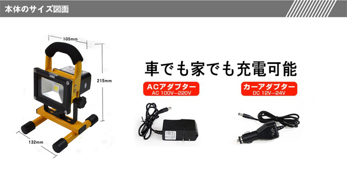 ◆充電式・コンパクト 充電式・コードレスで電源の取れない場所でも使用できる。 ◆床スタンド付き 安定感のあるスタンド一体型で、平らな地面に直置きしてご使用できます。 ◆持ち手付き 持ち手付きで離れた場所でも使用できます。 ◆家でも車でも充電可能 充電はAC100V-240Vでご家庭・海外で充電、DC12V/24Vでシガーソケットから車内でも充電可能です。