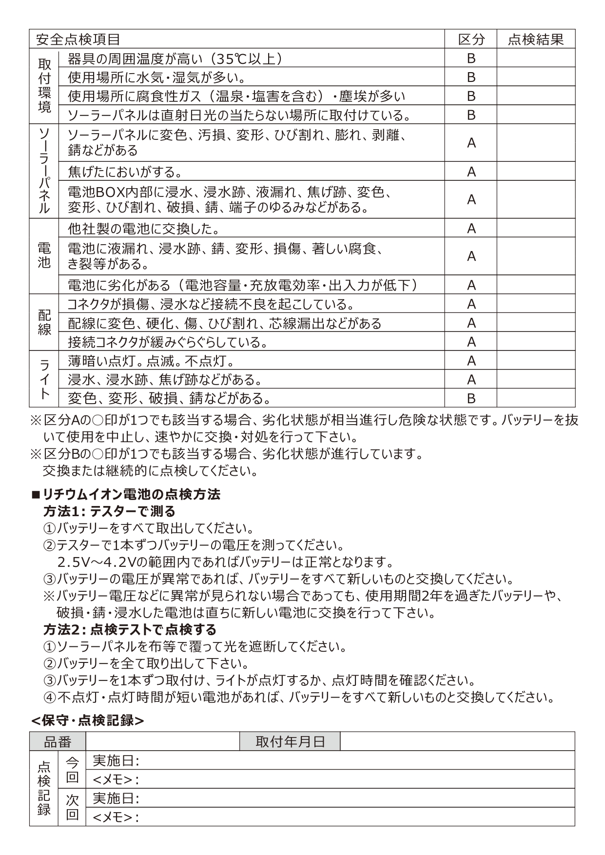 ※ソーラー発電システムが正常に作動しているか確認の為、約半年に一度自主点検を行ってください。